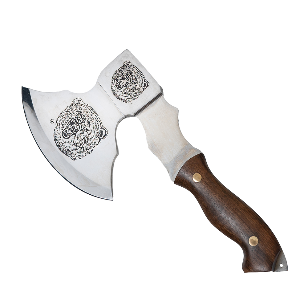 Топорик «Вепрь» относится к ножам хозяйственно-бытового назначения, холодным оружием не является. Предназначен топорик в первую очередь для разделки мяса, выполняет функции кухонного топорика. Клинок «Вепря» изготавливается из стали AUS-8, имеет длину 185 мм, с максимальной толщиной 3,7 мм. Твердость стали составляет 55-57 HRC, металл отличается хорошей коррозионной стойкостью. Клинок ножа имеет прямоугольную форму с небольшим изгибом режущей кромки от основания к острию. В передней части клинка находится отверстие для удобства хранения на стеллаже. Заточка клинка вогнутая, имеющая оптимальный угол для нанесения рубящих ударов. Рукоять ножа изготовлена из напрессованного на всю длину хвостовика резинопластика Elastron G, имеется отверстие под темляк. Материал рукояти обеспечивает надежный хват и позволяет мыть нож в посудомоечной машине. Полная длина «Вепря» составляет 310 мм, вес без ножен – 457..464 г. Нож достаточно массивный, со смещенным к острию центром тяжести, что позволяет легко перерубать куриные кости, суставы и рубить замороженное мясо. Также нож можно использовать в качестве лопатки для загрузки готовой нарезки на сковороду.